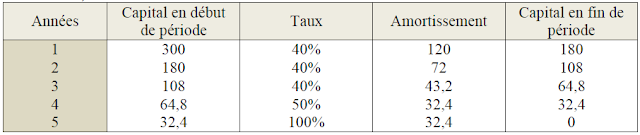 Ainsi de suite, jusqu’à la quatrième année où le taux dégressif devient 50% parce que l’amortissement est devenu inférieur à 40%. Puis, à la dernière année le taux dégressif est de 100% afin d’amortir le capital en fin de période (C.F.P en année 5 = 0).